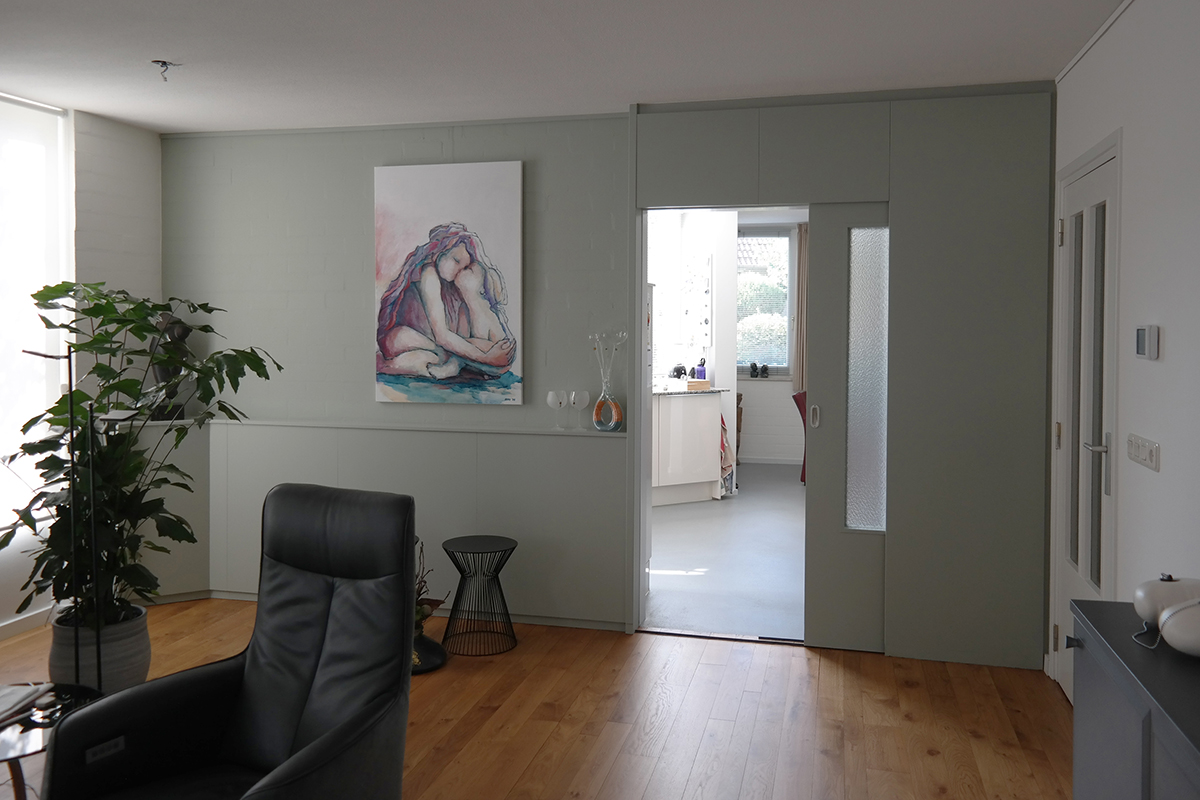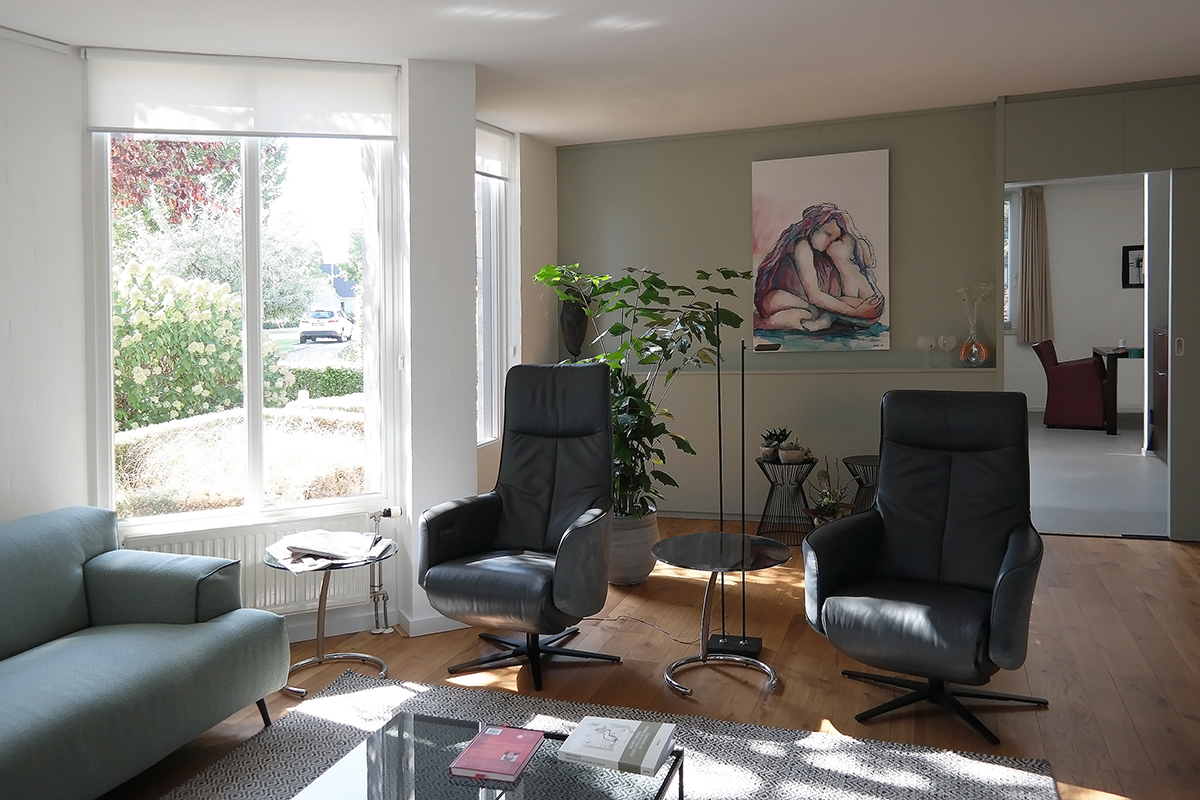 De woonkamer was niet meer naar wens: het zitgedeelte was een kleine hoek in de ruime kamer en vormde geen eenheid met de naastgelegen eetkeuken.